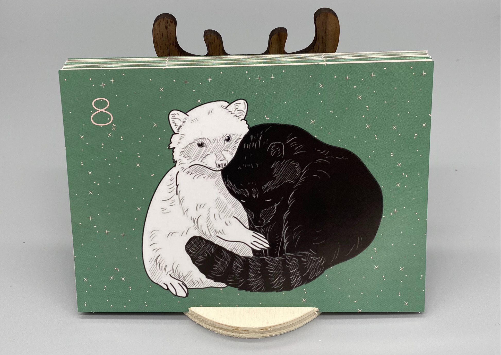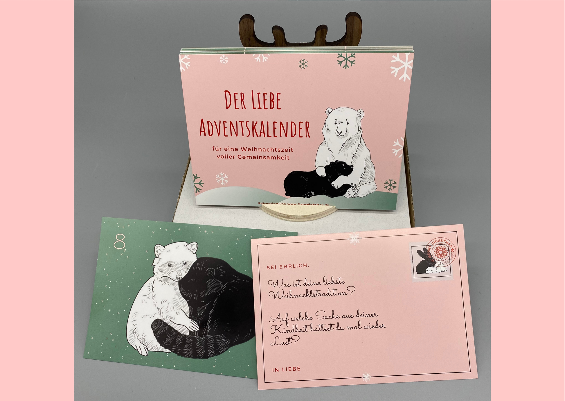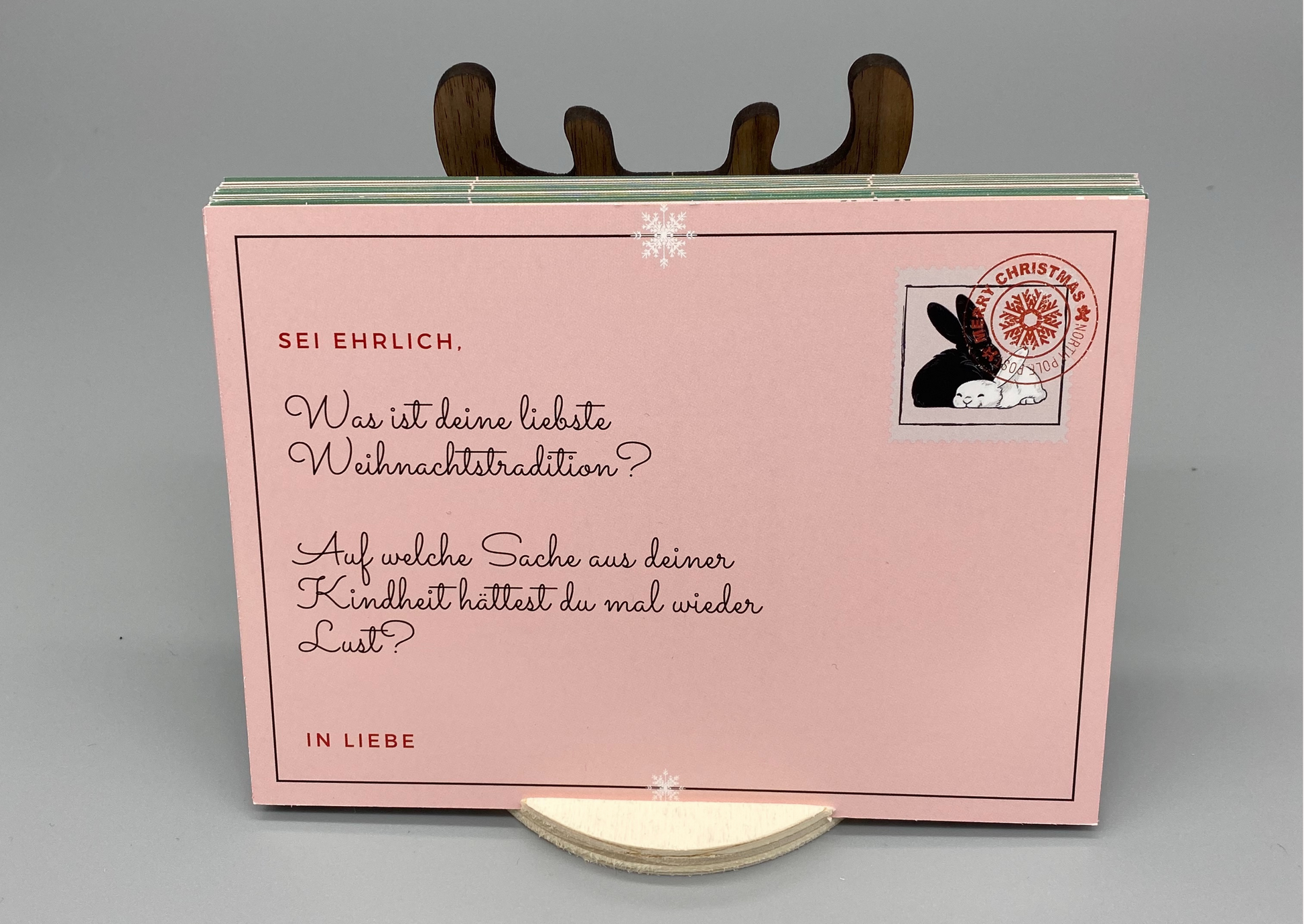 Genieße jeden Tag ein paar Minuten liebevolle Zweisamkeit mit dem Liebe Adventskalender. Im Paket enthalten sind 24 Postkarten und ein niedlicher Elch-Kartenhalter aus Holz.
